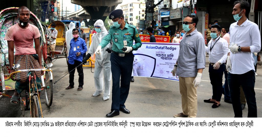 সবাই মিলে সচেতন থাকি শহরটাকে করোনা মুক্ত রাখি এই শ্লোগান নিয়ে চট্টগ্রাম নগরীতে প্র্রাণঘাতী কোভিড ১৯ ভাইরাস প্রতিরোধে ক্যাম্পেইন ও স্যানিটাইজ করা লক্ষে অপসনিন ফার্মার সহযোগিতায় আই টি প্রতিষ্ঠান এশিয়ান ডেটা প্লেজ তিনদিনের কর্মসূচী শুরু করেছে। চট্টগ্রাম শহরের পুলিশ চেকপোস্ট গুলোতে সকাল ১০ থেকে বিকেল ৪ টা পর্যন্ত নগরীতে চলাচল কারী পরিবহন ও চালকদের মাঝে হ্যান্ড স্যানিটাইজার করে দেওয়া,পরিবহনে জীবাণুনাশক স্প্রে করা, স্যানিটাইজার বিনা মূল্যে বিতরণ করার পাশাপাশি সচেতনতা লক্ষে ক্যাম্পেইন করা হবে। আগ্রাবাদ, জি ই সি মোড়, নিউ মার্কেট, ই পি জেড এবং সিটি গেট এ সব চেক পোস্টে প্রতিষ্ঠানের কর্মীরা একাজ করবে। গত ২৩ এপ্রিল চট্টগ্রাম সকাল দশটায় নগরীর জি ই সি মোড়ে এশিয়ান ডাটা প্লেজের চেয়ারম্যান নাদিম আহমেদ, সিইও খুররাম নাঈম এর তত্ত্বাবধানে এই কর্মসূচীর উদ্ভোধন করা হয়। কর্মসূচীর উদ্ভোধন করেন চট্টগ্রাম মেট্রোপলিটন পুলিশ, ট্রাফিক এর অ্যাসি: ডেপুটি কমিশনার ওয়াহিদুল হক চৌধুরী।এ সময় উপস্থিত ছিলেন অপসনিন ফার্মার অ্যাসি: সেলস ম্যানেজার,মো: জাহাঙ্গীর আলম। এশিয়ান ডাটা প্লেজ ডিরেক্টর অব টেকনিক্যাল অপারেশন আকরাম আব্বাস, শামিয়া তাবাচ্ছুম, শেখ জাবের আল মিজান, সোহরাব হোসেন । এই কর্মসূচী বাস্তবায়নে এশিয়ান ডাটা প্লেজ এর সাথে সমন্বয়ে ছিলেন চট্টগ্রাম মেট্রোপলিটন পুলিশের ট্রাফিক ডিভিশন, চট্টগ্রাম বাংলাদেশ রেড ক্রিসেন্ট সোসাইটি। সামাজিক দুরত্ব নিশ্চিত করা ও স¦াস্থ্যবিধি মেনে চলার বিষয়টি মাথায় নিয়ে এই করোনা মহামারী দুর্যোগকে প্রতিহত করতে এবং মানুষের সংক্রমনরোধে সচেতনতায় এশিয়ান ডাটা প্লেজ কর্মকান্ড চালিয়ে যাবে বলে আয়োজকগণ এ প্রত্যয় ব্যক্ত করেন।